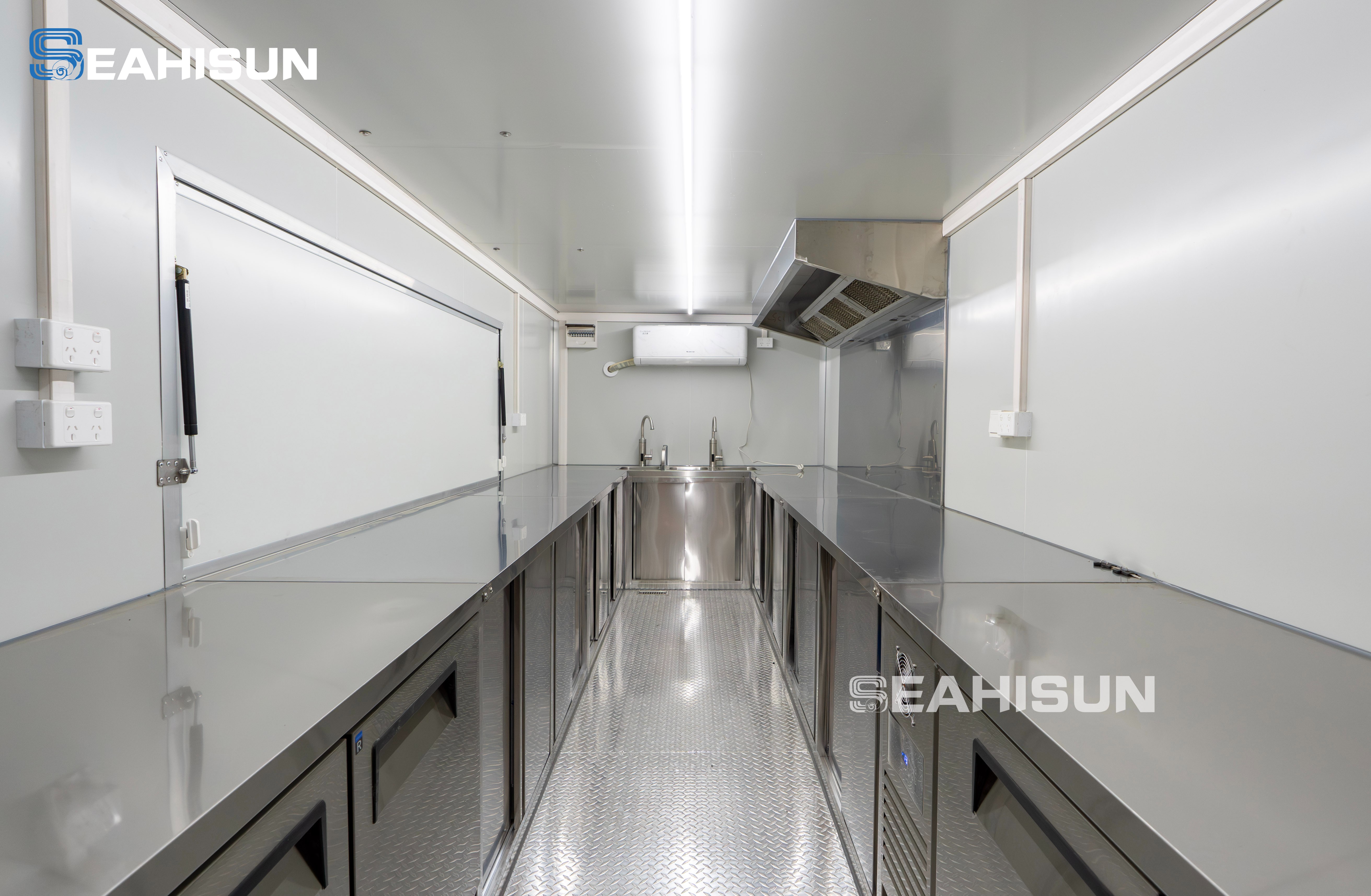 The interior is equipped with 304 stainless steel countertops and cabinets, standard commercial exhaust hood, LED lighting and waterproof sockets. Griddles, fryers, double sinks, refrigerators and other equipment can be added as needed, fully complying with food safety standards including FDA and NSF.