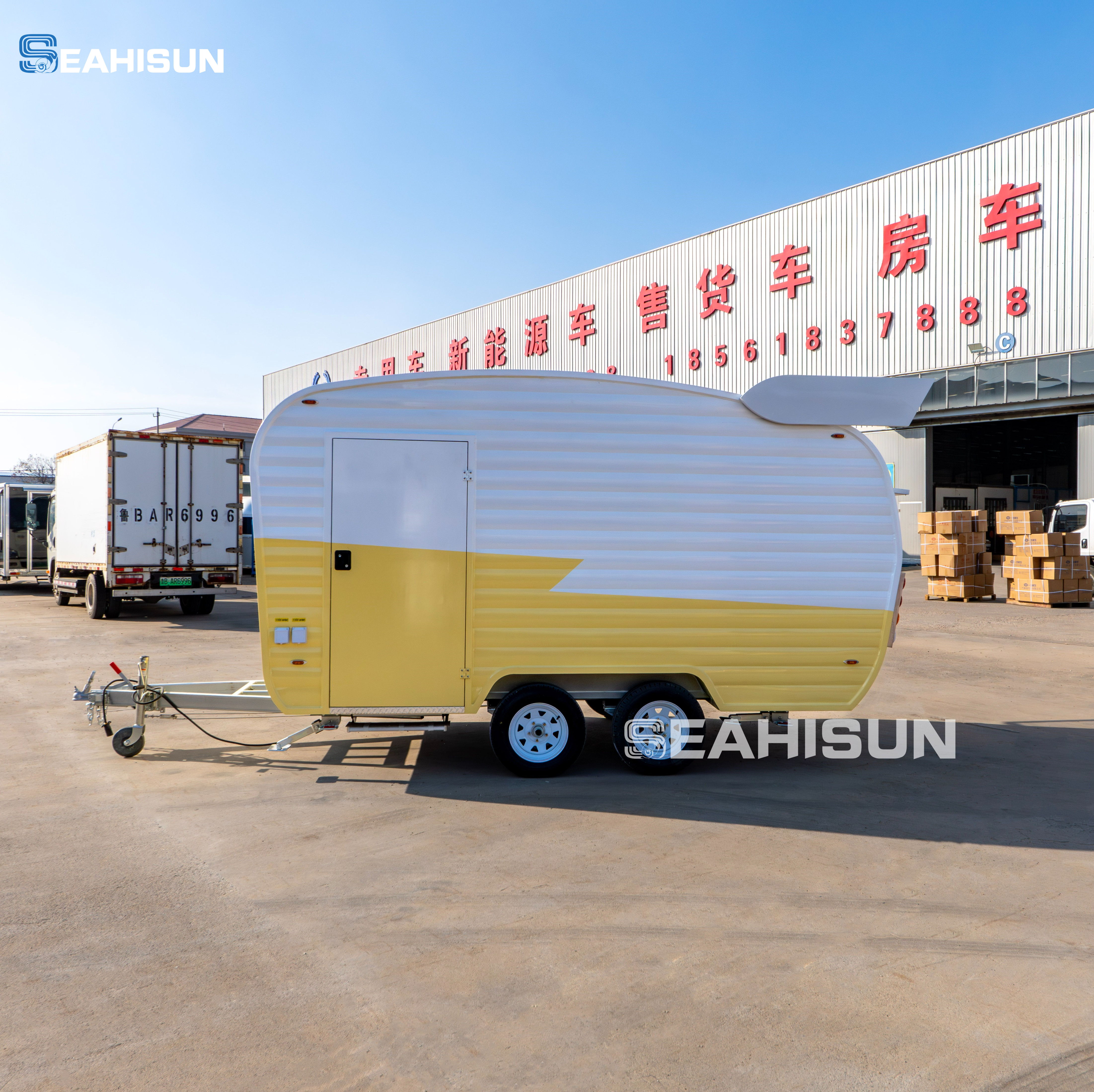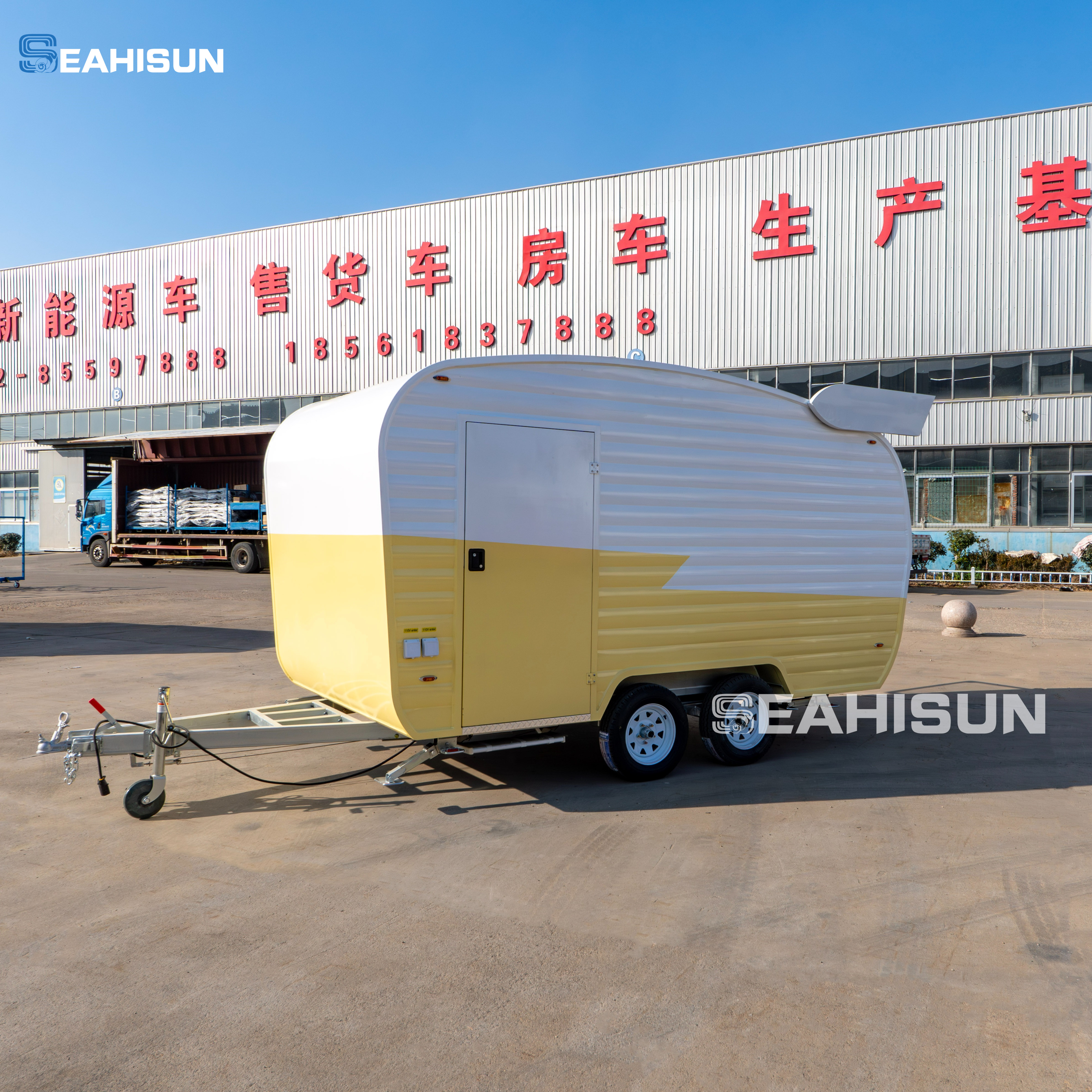 This high-quality towable mobile food trailer is a professional commercial catering vehicle designed for versatile street food and beverage business operations. Adopting the classic and fashionable Airstream streamline body shape, it has a stunning white and yellow color matching on the exterior, the smooth curved body not only has an eye-catching visual effect to attract more customers, but also features excellent structural stability and wind resistance. The trailer is equipped with a large flip-up service window with a retractable sunshade panel, which provides a spacious and comfortable operation space for vendors, and effectively blocks sunlight and rain during outdoor business, ensuring a smooth service experience.