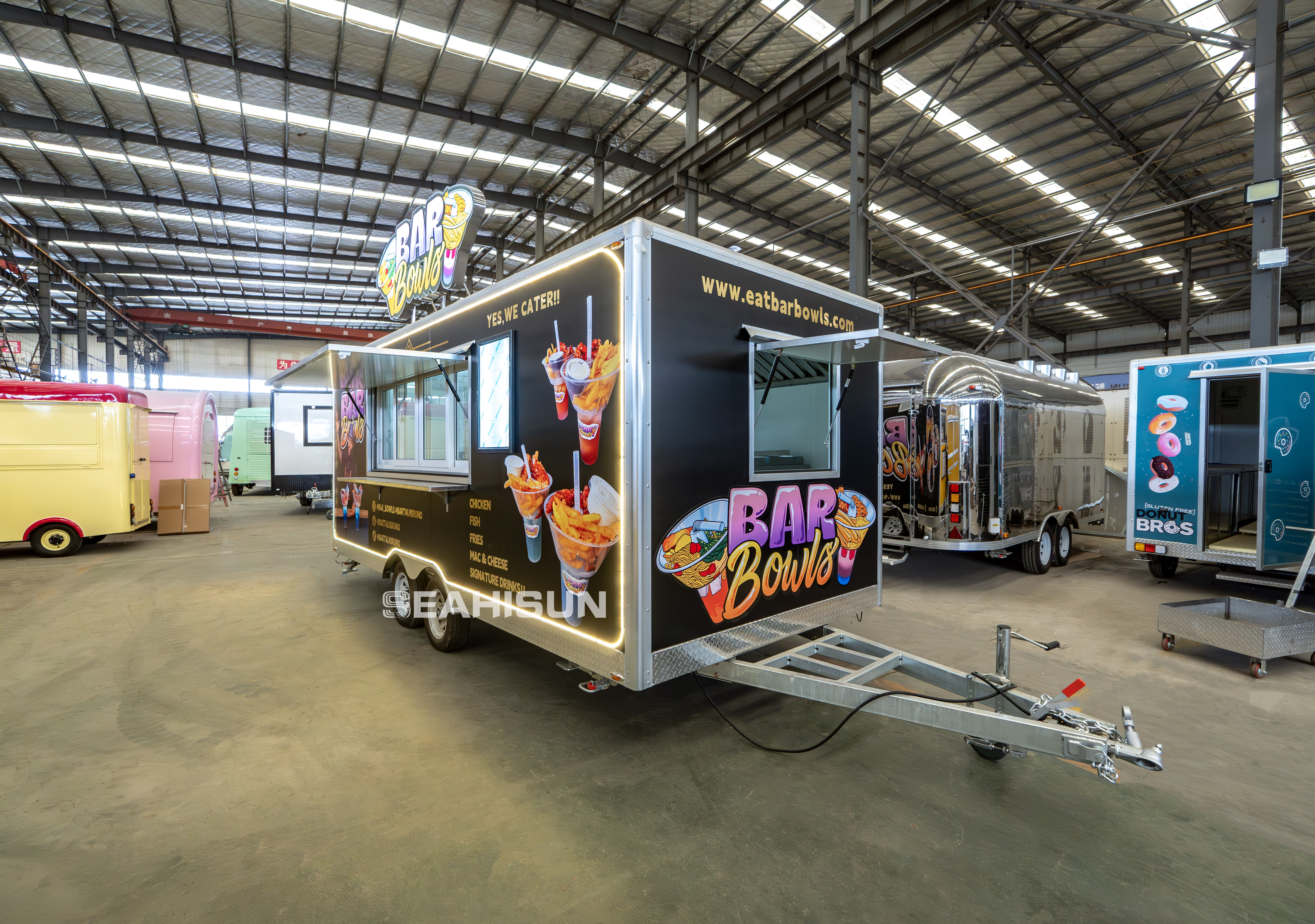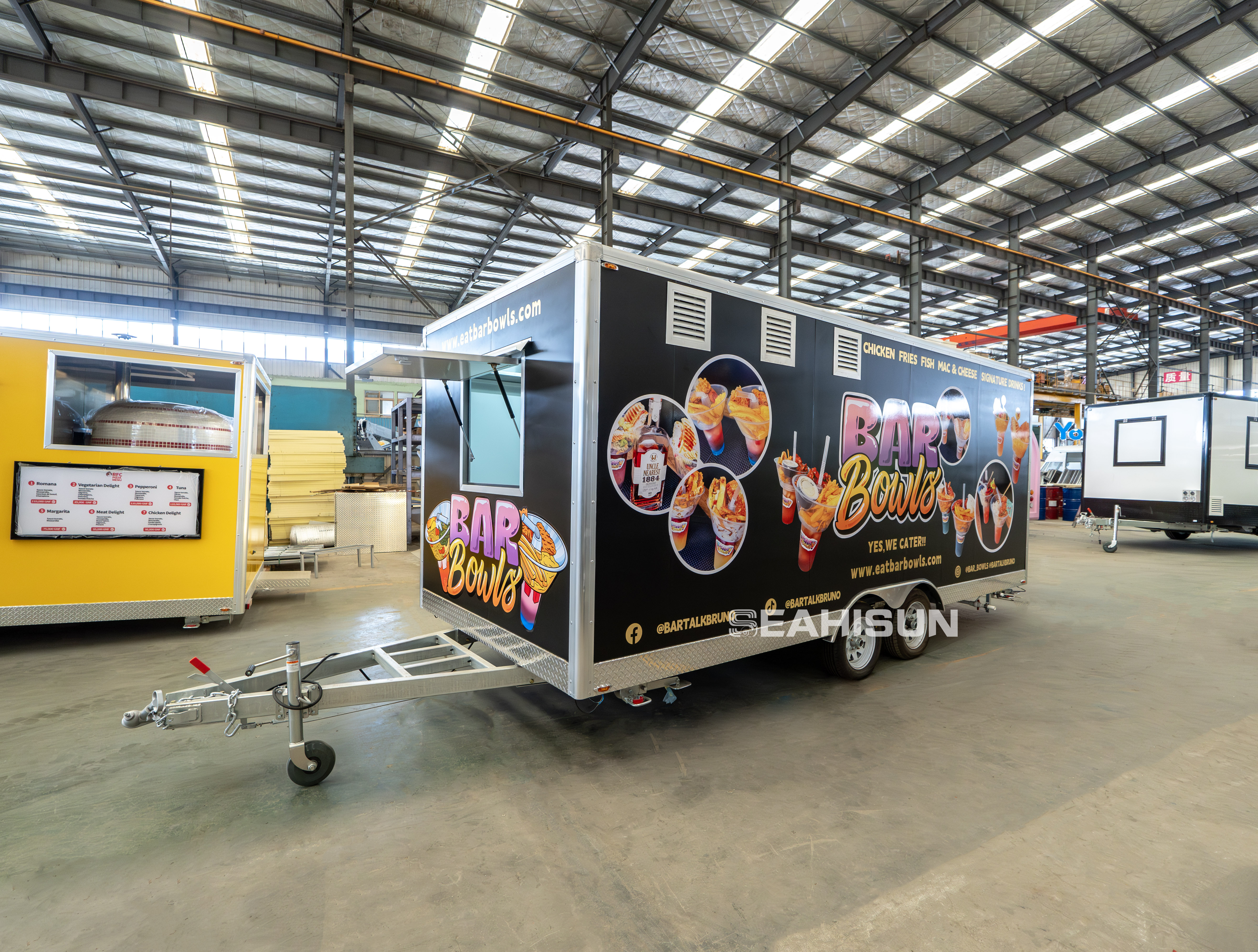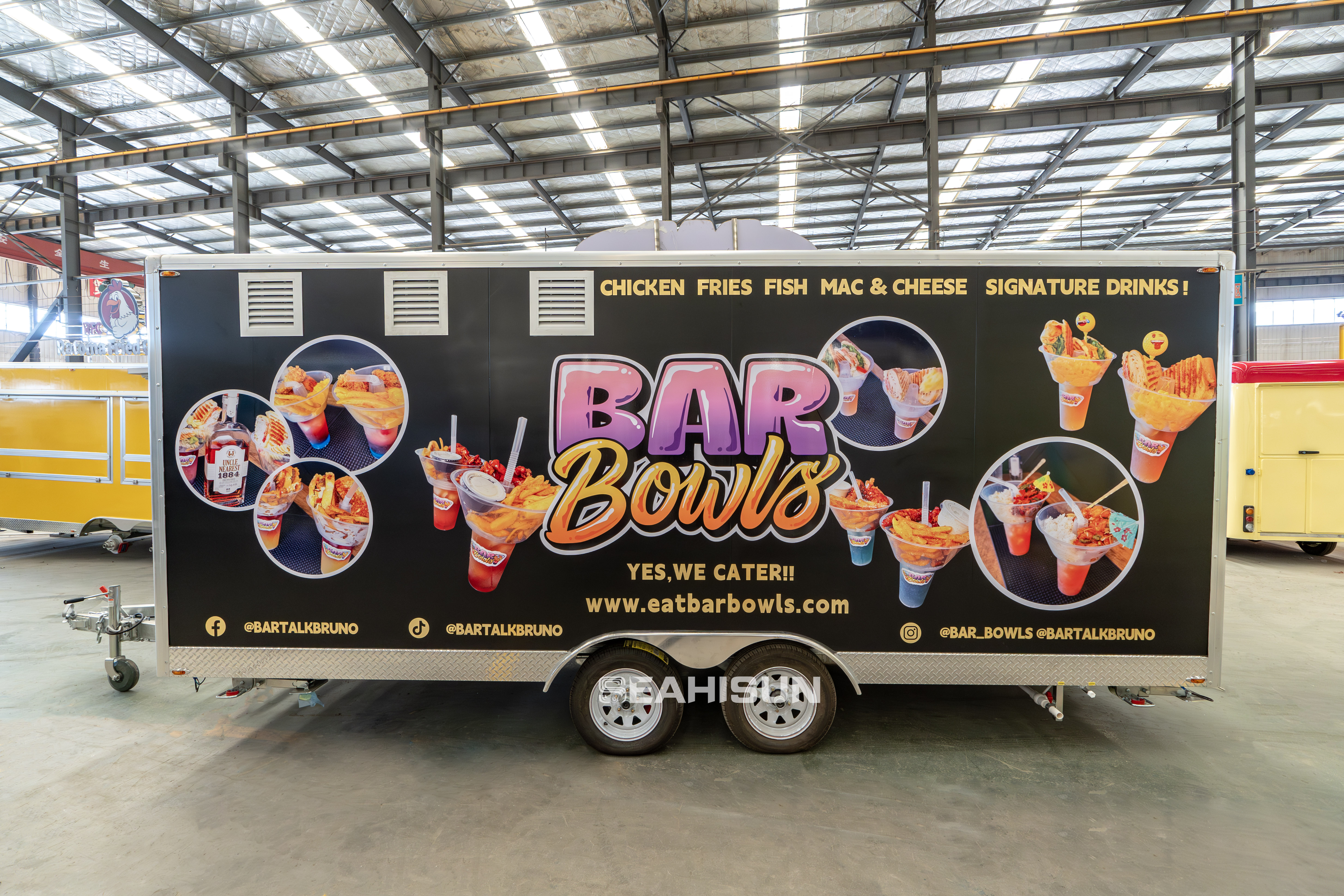 Main Color: The trailer features a professional and striking black as the primary color, complemented by vibrant, cartoon-style "BAR Bowls" branding and food graphics, creating a strong visual impact.