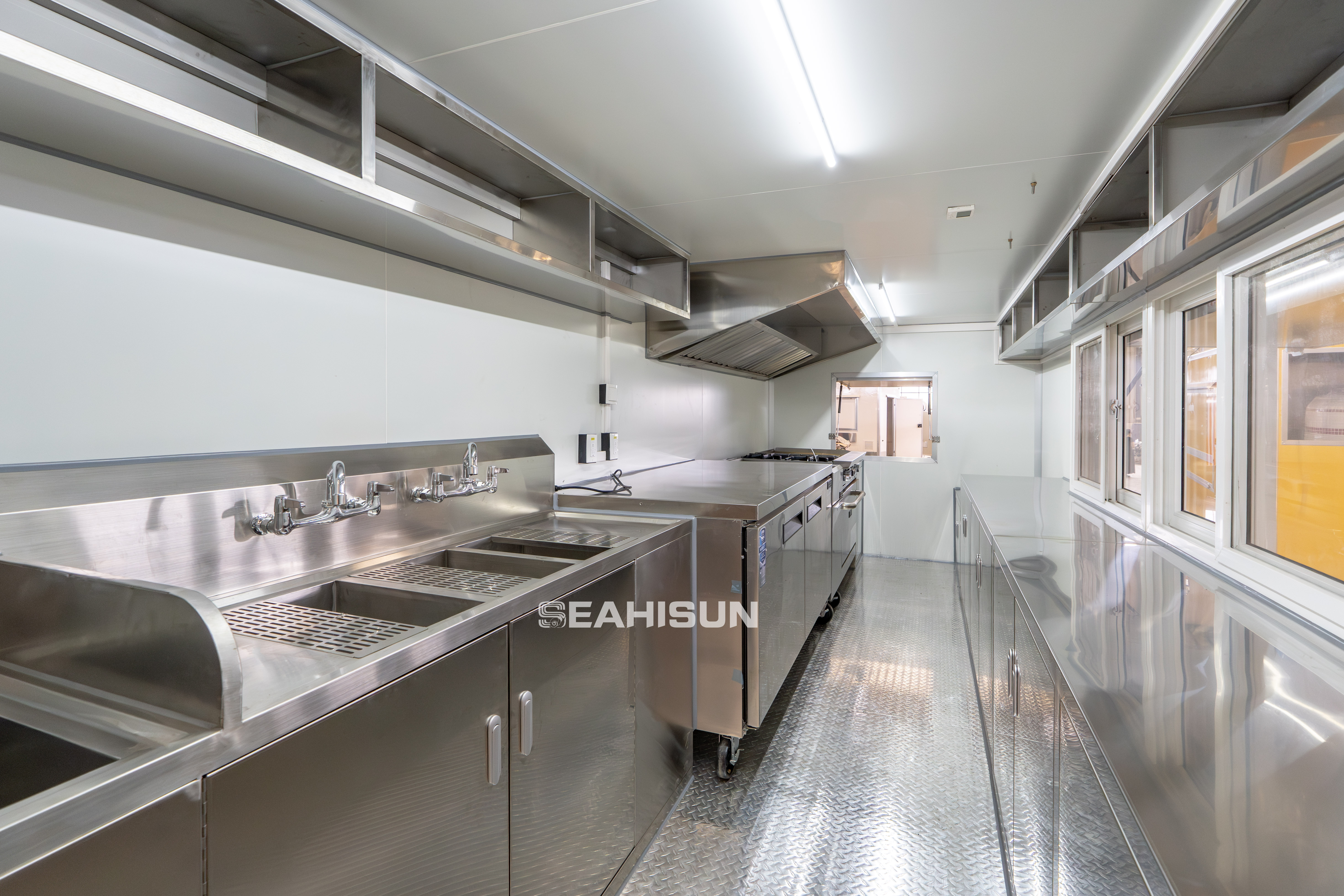 The interior can accommodate various cooking equipment to fulfill diverse business needs, including a refrigerator, coffee machine, fryer, griddle, exhaust fan, oven, and more.