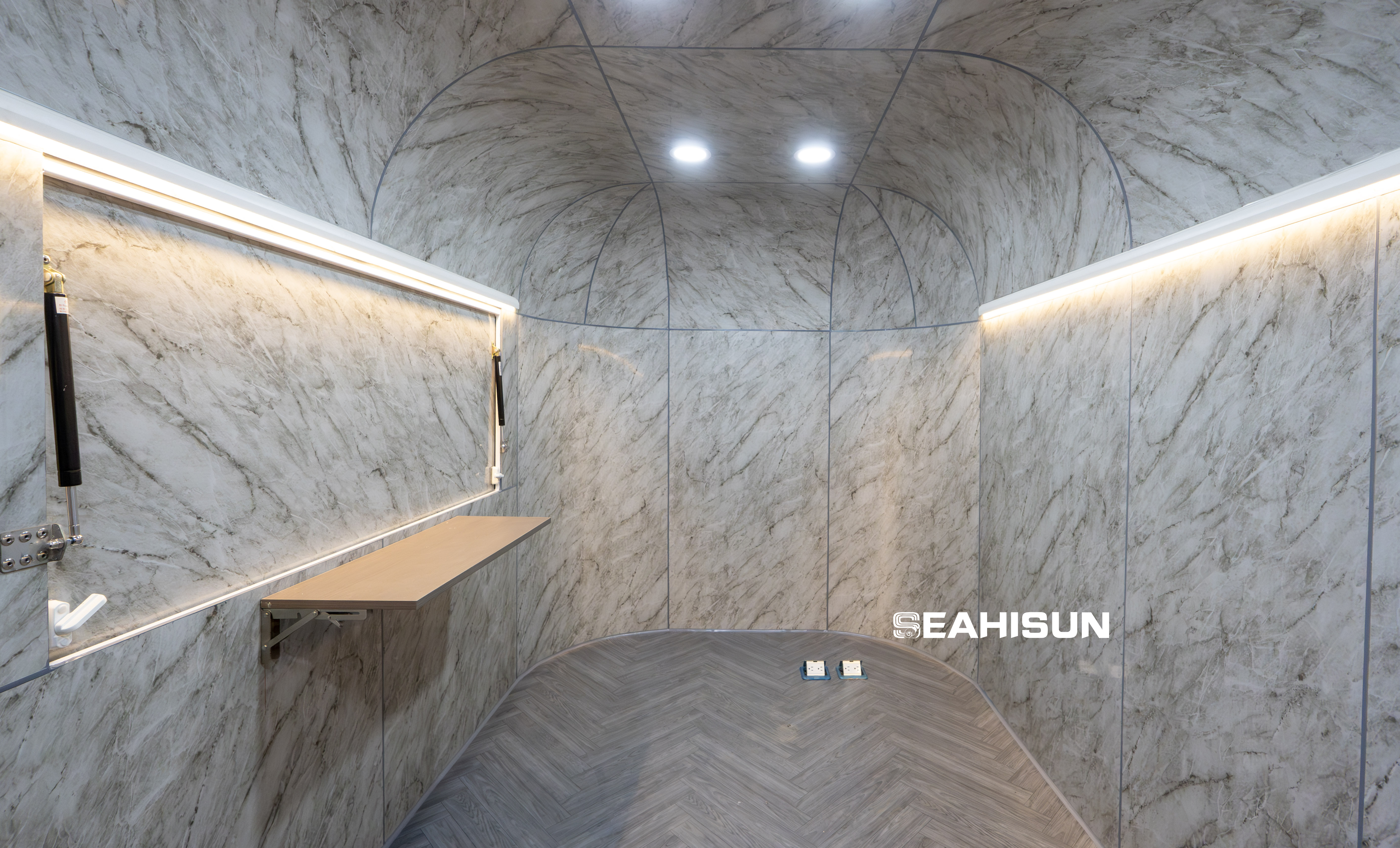 Showcases overall interior design of the food truck. The walls are adorned with elegant stone-like materials, complemented by warm lighting that creates a cozy atmosphere.